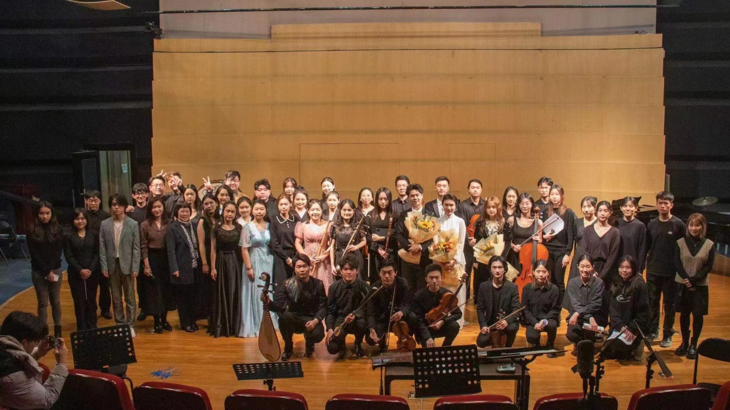 音乐会最后主讲人单奕翔为大家预告了“致敬系列”明年的演出计划,本场演出的艺术顾问音乐学系党总支书记吴晓萍教授、指导教师钱亿松老师与所有演职人员合影留念。线上直播的最终观看数量达到3000余人,音乐会圆满落幕。