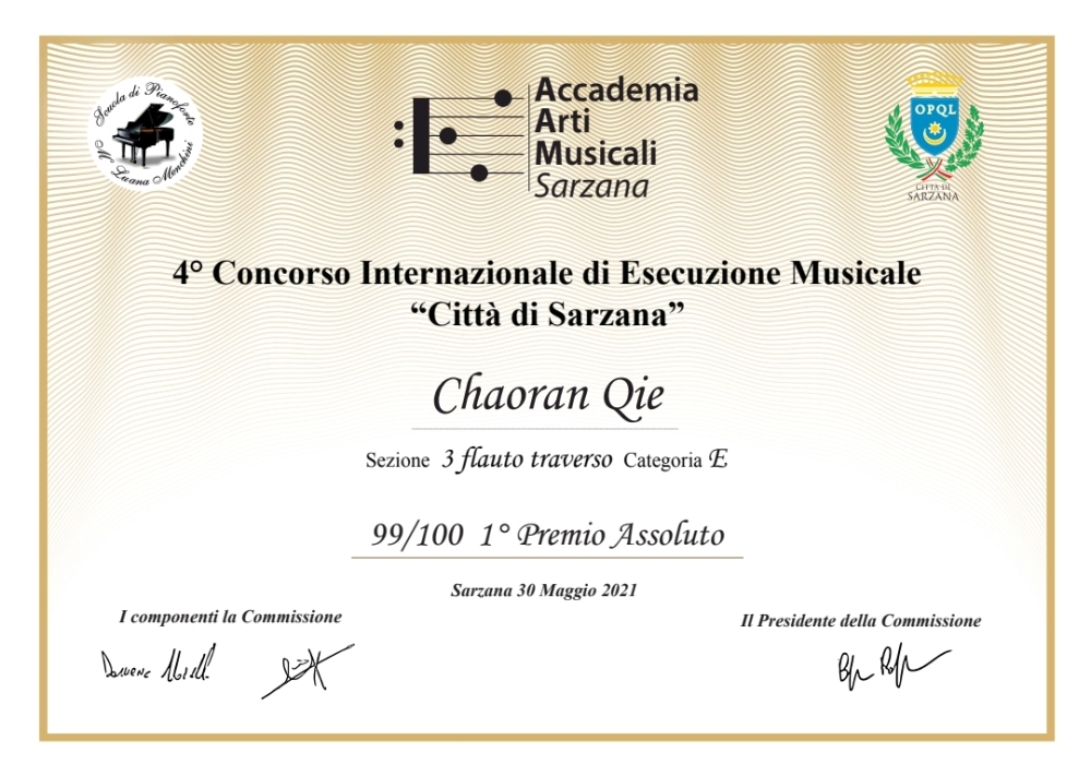 在近期结束的2021年第四届意大利萨尔扎纳城国际音乐比赛中,beat365官网高二年级郄超然同学获得了长笛专业E组特等奖!(指导教师:李凌副教授)