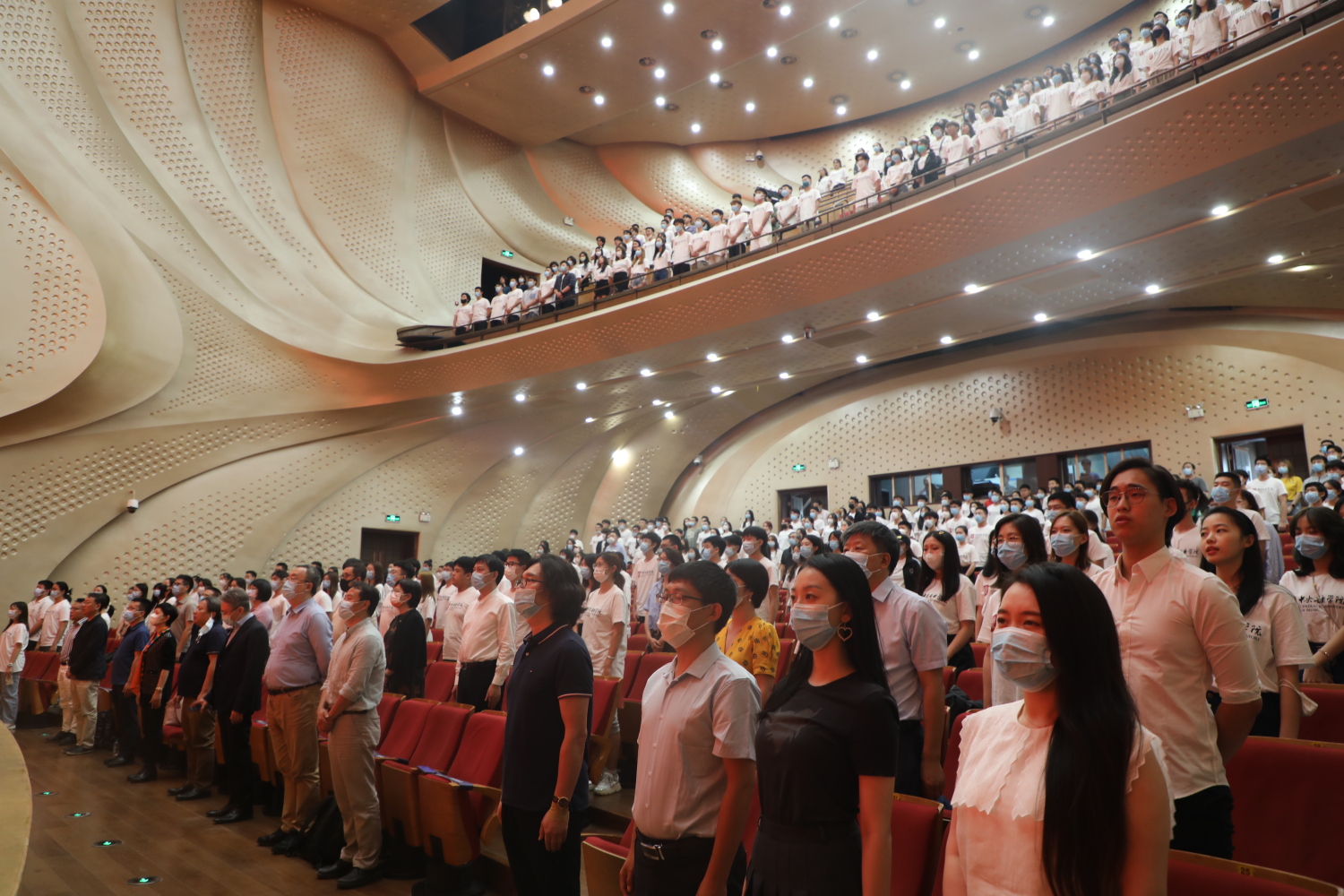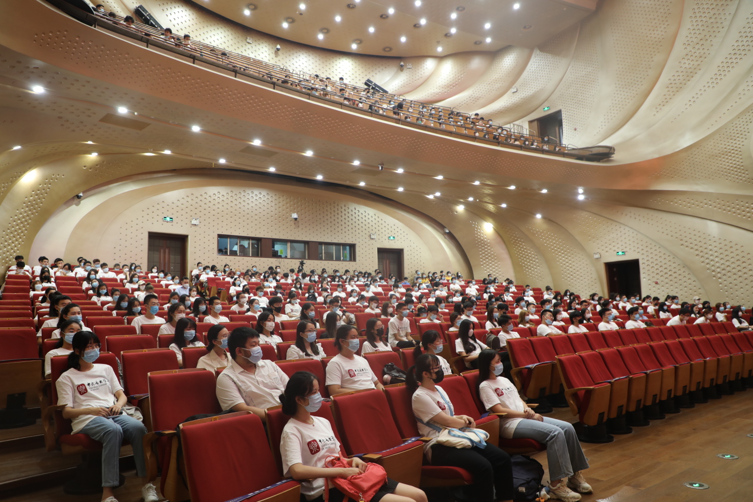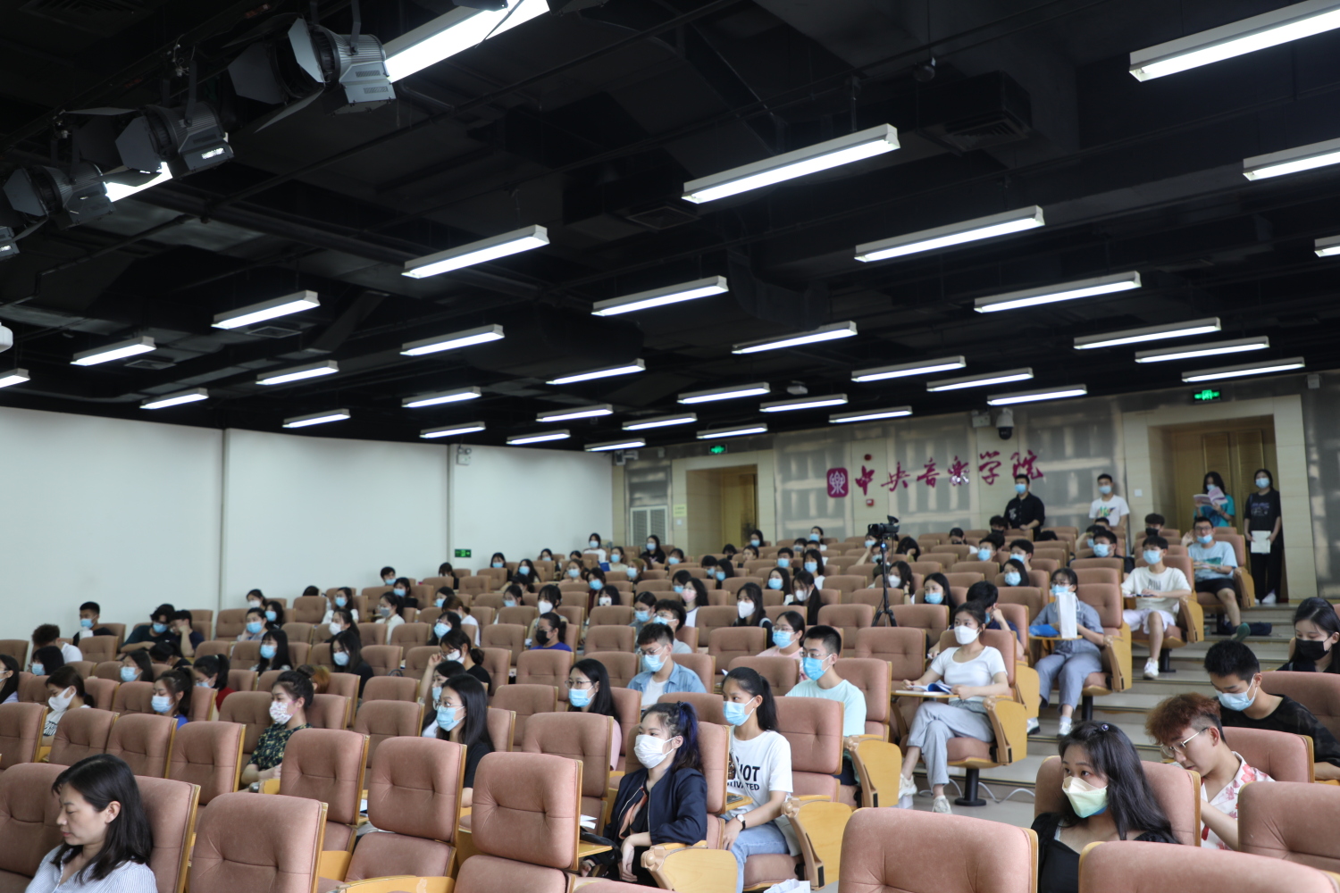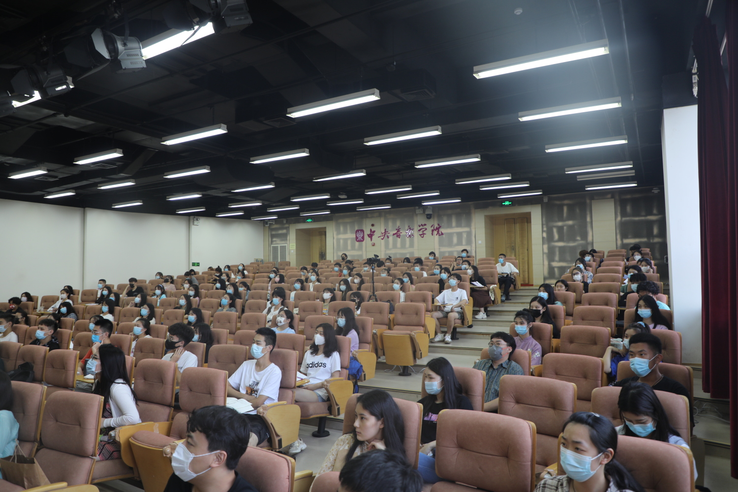为保证疫情防控安全,本次新生教育活动设一个主会场、八个分会场,并通过“央音视频”平台进行全程网络直播。同学们间隔而坐,戴好口罩共同学习和聆听。