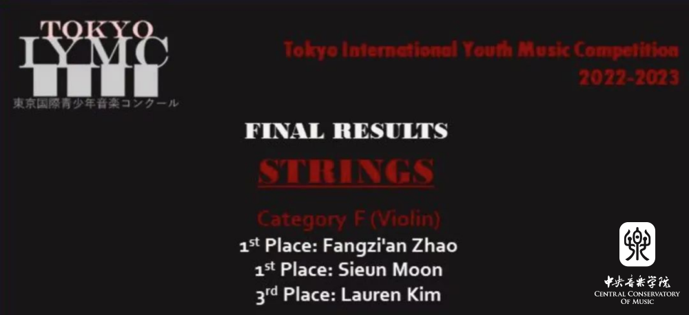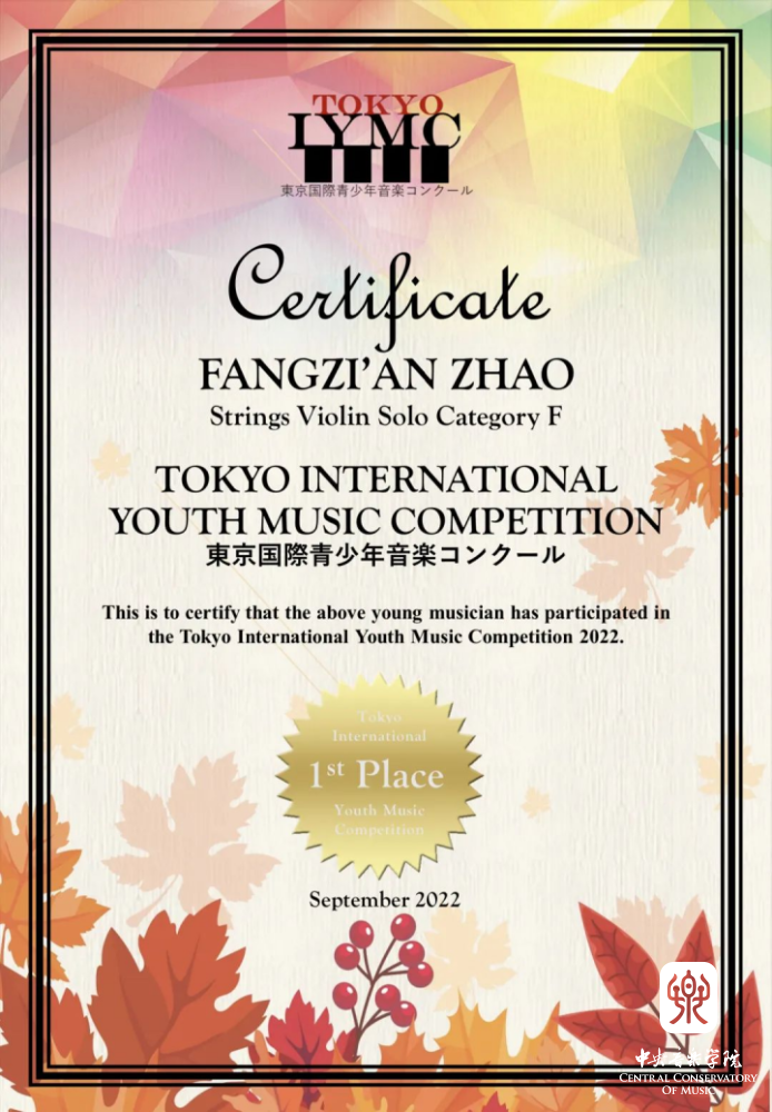 在刚刚结束的2022年日本东京青少年国际音乐比赛 (Tokyo International Youth Music Competition)落下帷幕。beat365官网附中小提琴专业赵方梓安同学经过激烈角逐,以97分的成绩夺得小提琴F组(少年组)第一名!