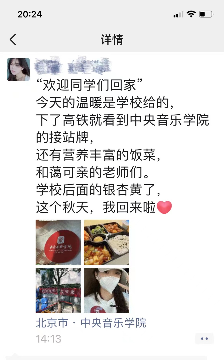 今天是我踏⼊⼤学的第⼀天,这⼀切对我来说既熟悉⼜新鲜。央⾳的⽼师们就像我们的⻓辈⼀样关⼼我们,从我们上⻜机到落地再到进学校,都有⽼师⾮常细致的保障我们的安全,让我们真正的感受到家的温暖。进⼊学校宿舍的⼤⻔后,有许多志愿者在忙忙碌碌的帮着我们消毒、提⾏李。⼗分耐⼼的跟我们讲解相关注意事项,并在我们需要的时候对我们给予帮助。我⾮常⾃豪我能到中央⾳乐学院进⾏学习深造,遇见这么好的⽼师和同学。祝愿我们有⼀个美好的四年!央⾳永远是我们的家。