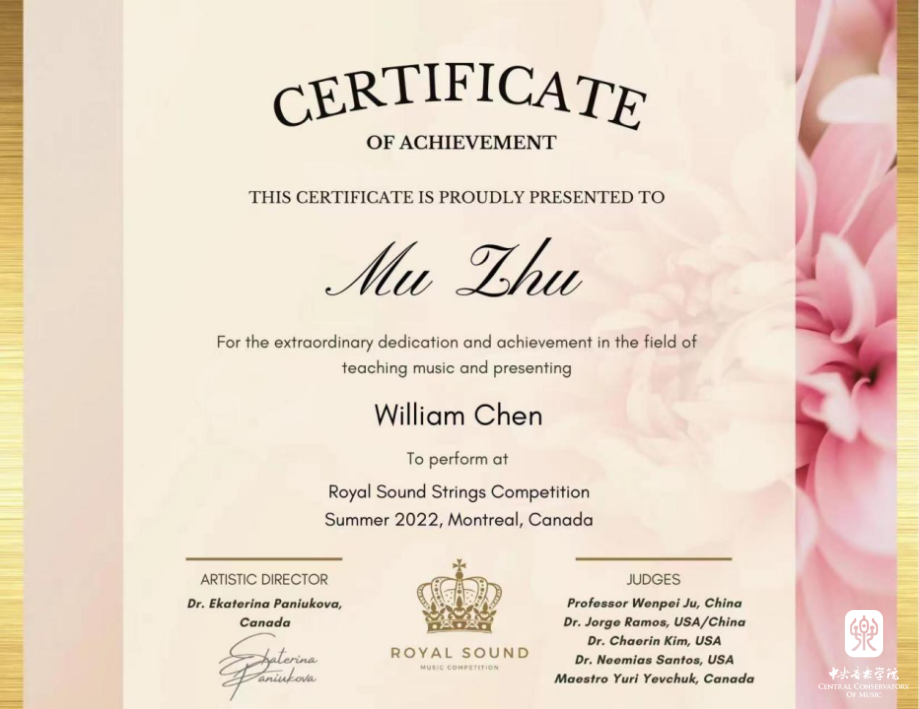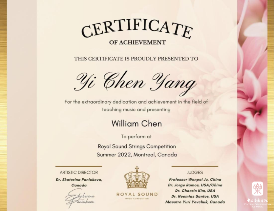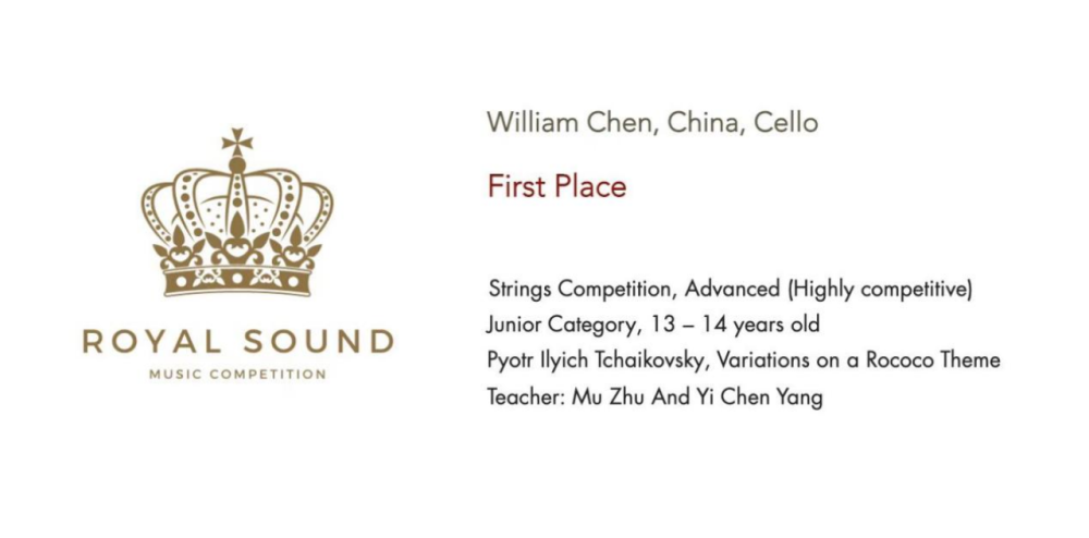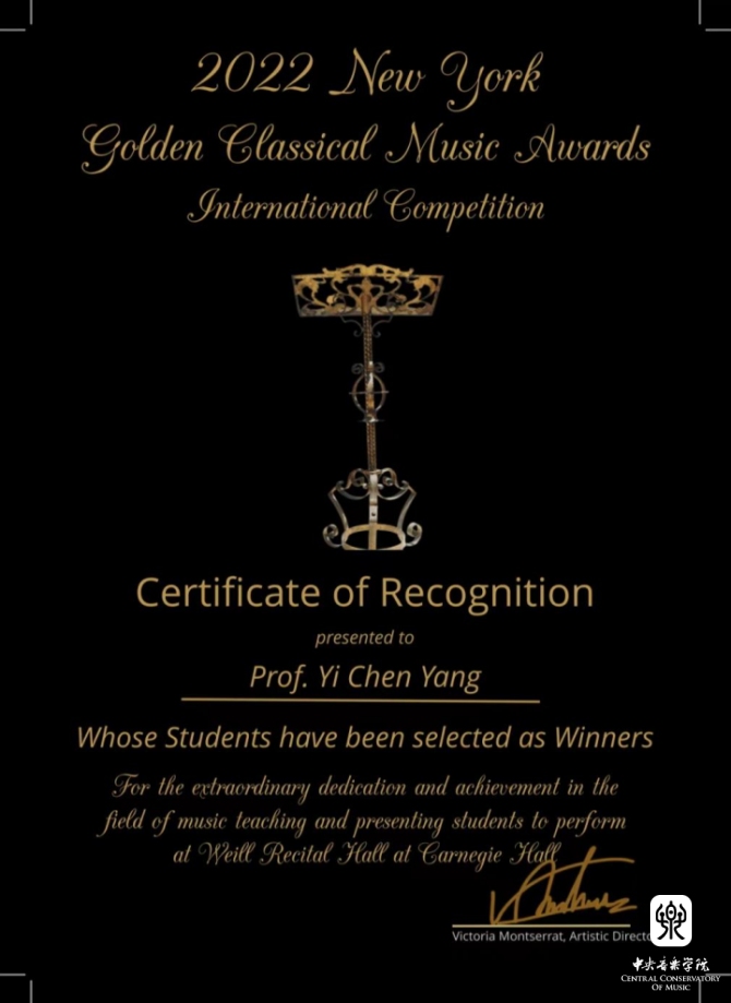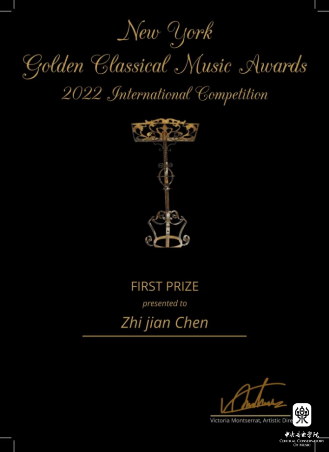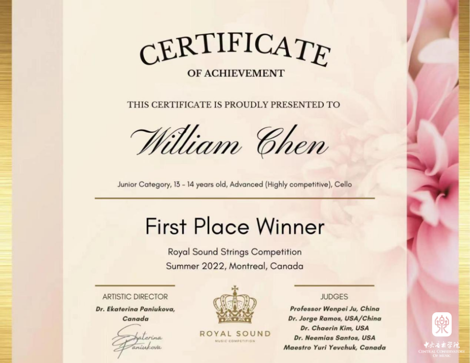 在刚刚落幕2022年“美国金色古典音乐国际比赛”中,beat365官网附中初二年级大提琴专业陈徵兼(William Chen)同学经过激烈的角逐,在众多参赛国家选手中脱颖而出,夺得13-15岁组一等奖,并受邀于2022年12月,前往美国卡内基音乐厅参加获奖者音乐会。同时,在2022年“加拿大皇家之声国际音乐比赛”中,陈徵兼同学再获大提琴13-14高阶组协奏曲比赛一等奖,受邀于今冬前往加拿大蒙特利尔和多伦多参加获奖演出。杨一晨老师、朱牧教授在两项比赛种荣获最佳指导教师奖。