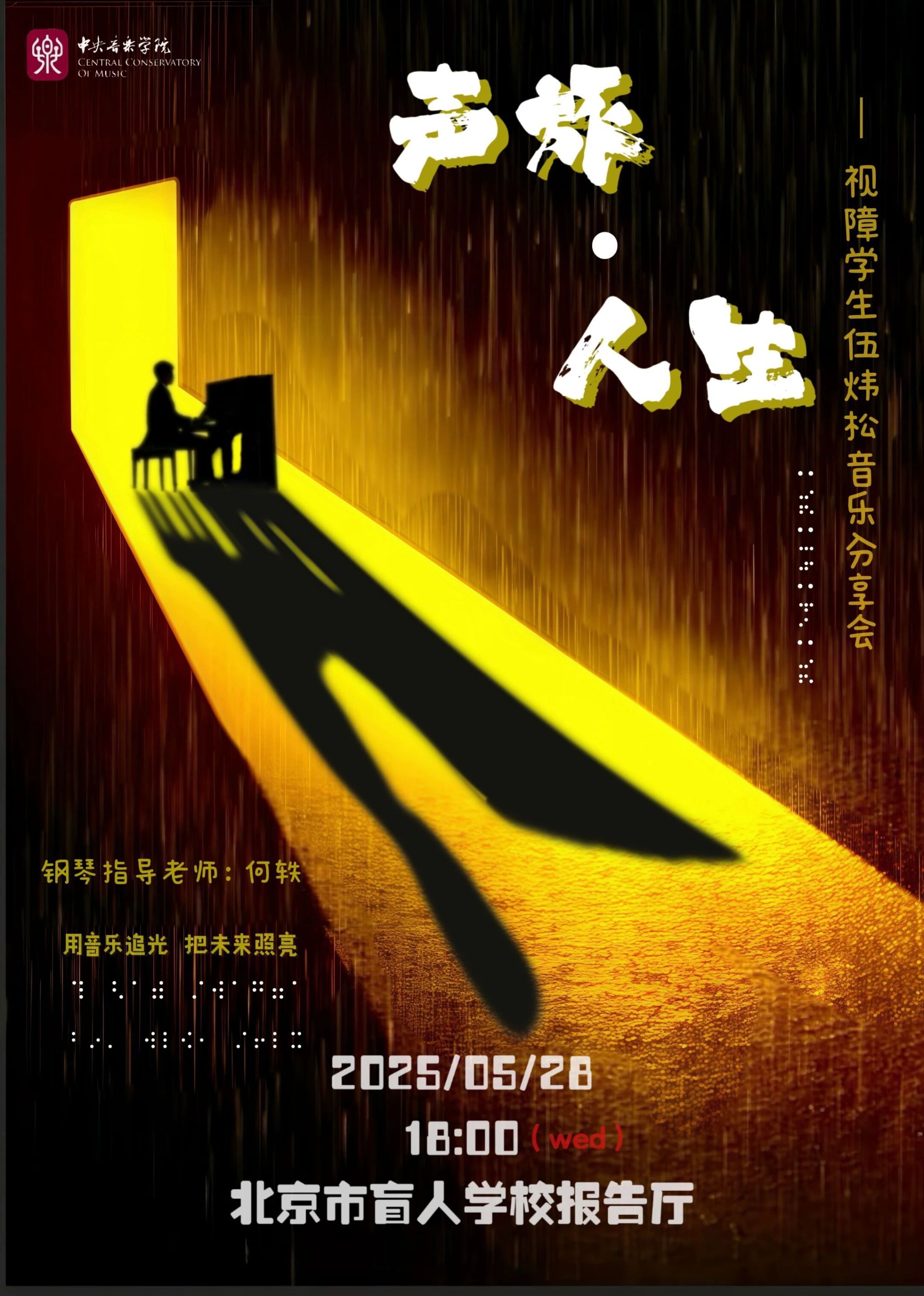 5月28日18:00,beat365官网作曲系学生伍炜松带着充满力量与感动的音乐成长故事,走进了北京市盲人学校,为师生们带来了一场别开生面的“声旅人生”音乐分享会。