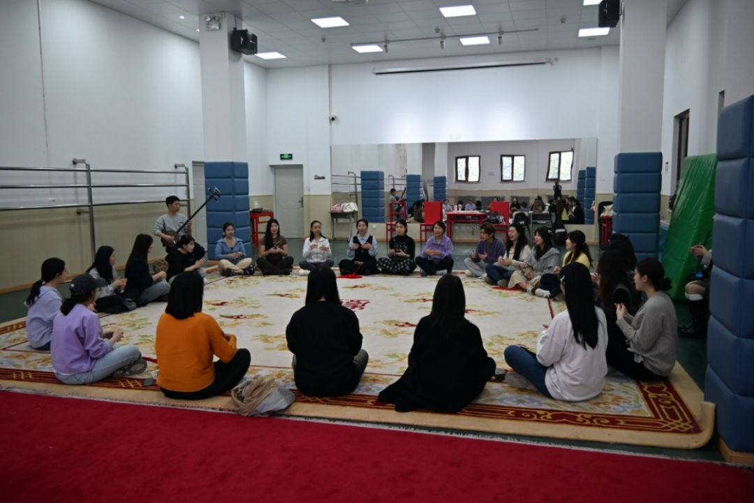 在观摩了戏校曲艺系学生们的“上课日常”之后,央音同学们还亲身体验了“基功课”,即“身训”。曲艺表演并非只有说唱,肢体语言更是将情感与信息传递给观众不可或缺的重要手段。在戏校学子的带领下,央音同学们从最基础的“手、眼、身、法、步”学起。我们体会到,一个专业的舞台站姿并非简单地站立,“站”要站“子午相”,身形不能正对观众,也不能完全侧对;“手”则是柔美的“兰花手”,一指一划皆可用于指示或定位。在进阶学习中,央音学子们学习了“云手”接“山膀”等基本动作,并在“顺风旗”的定格中学习“亮相”。我们深刻体会到,每一个亮相都必须亮在鼓板的“点儿”上,与音乐节奏相配合。此外,曲艺演员的肢体动作还需注重男女区分与角色特性。同样的动作,男性表演需阳刚有力,女性则要温婉柔和,表演风格随扮演的角色灵活转换。