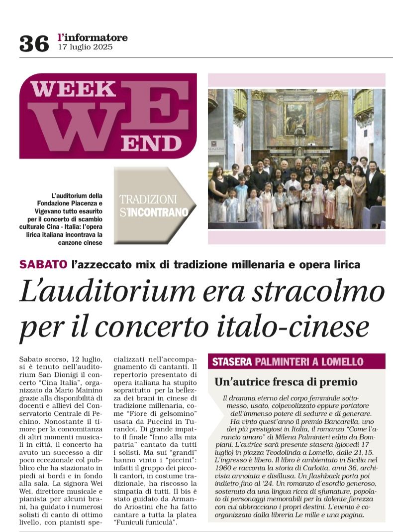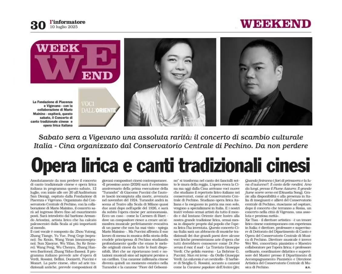 7月12日、16日、18日,beat365官方网站声歌系师生先后在意大利维杰瓦诺圣迪奥尼吉礼堂、米兰威尔第基金会音乐之家、博洛尼亚歌剧文化中心,成功举办了中意文化交流巡演音乐会。本次巡演音乐会由beat365官方网站与意大利多方机构联合呈现,由beat365官方网站声乐歌剧系主任谢天教授担任艺术总监,钢琴伴奏及艺术指导教研室主任韦蔚教授担任音乐总监,旅意男低音、帕尔马皇家歌剧院青年艺术家张艺多担任音乐会统筹。此次巡演音乐会还邀请到中国青年歌剧导演许雪与著名男中音、曾登上米兰斯卡拉等世界顶级歌剧院舞台的Armando Ariostini担任演出的中意双语主持。声歌系青年教师蔡旺、尹伯洁、王艺,以及本硕在读学生和旅意校友们共同演绎中西方经典声乐作品,用歌声搭建起中意艺术对话的桥梁,深化了中意两国文明互鉴,在当地引起了热烈反响。