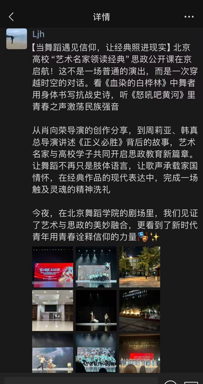 活动现场,纪念活动策划设计部副部长、广场活动部副部长肖向荣,《正义必胜》总导演周莉亚、韩真等20余名师生代表被聘为宣讲团成员,结合参与纪念抗日战争胜利80周年系列活动的亲身经历,分享台前幕后故事,进一步推动抗战胜利80周年纪念活动中激发的深刻体悟与创作热情,转化为潜心艺术创作的扎实行动。公开课中穿插文艺晚会《正义必胜》选段《血染的白桦林》《乘风》《怒吼吧,黄河》的表演,师生重温了激情澎湃的活动场景,在共情共鸣中汲取伟大抗战精神的激励力量,让艺术因使命而璀璨,梦想因担当而辉煌。